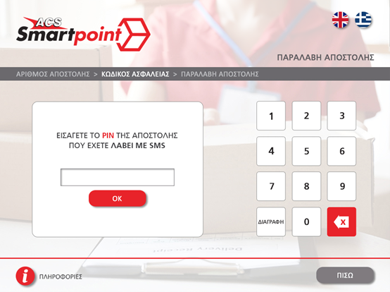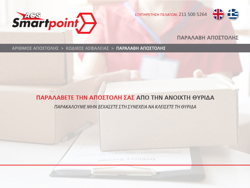 Για να παραλάβετε την αποστολή σας από ένα σημείο ACS Smartpoint Locker, απαιτείται να έχετε τον κωδικό αποστολής (10 ψήφιος αριθμός) και τον μοναδικό κωδικό PIN (6ψήφιος κωδικός) που σας έχει σταλεί με μήνυμα sms ή Viber.