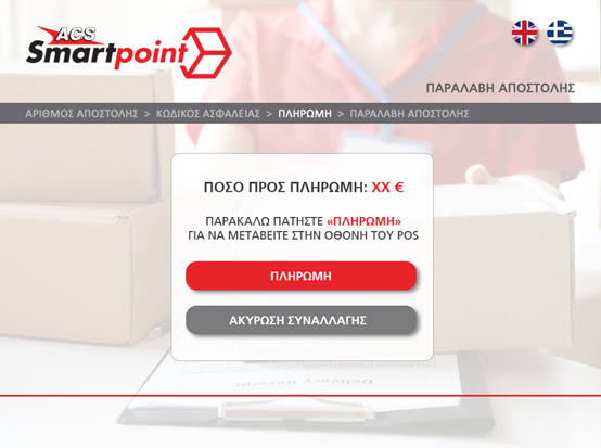 Σε περίπτωση που έχετε επιλέξει την υπηρεσία αντικαταβολής, πατήστε «ΠΛΗΡΩΜΗ» και περάστε την κάρτα σας (Visa ή Mastercard) στο τερματικό pos που βρίσκεται δίπλα από την οθόνη.