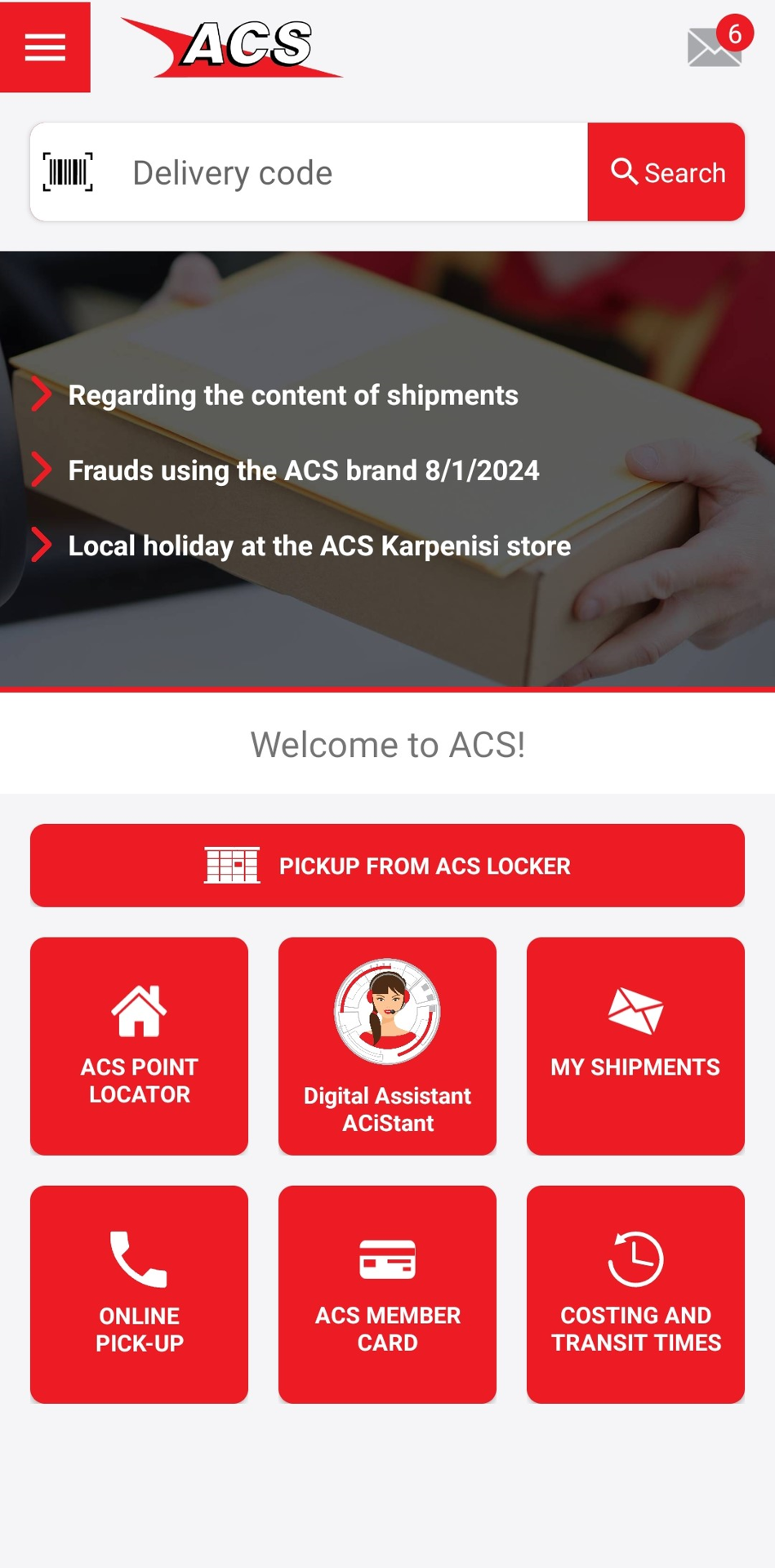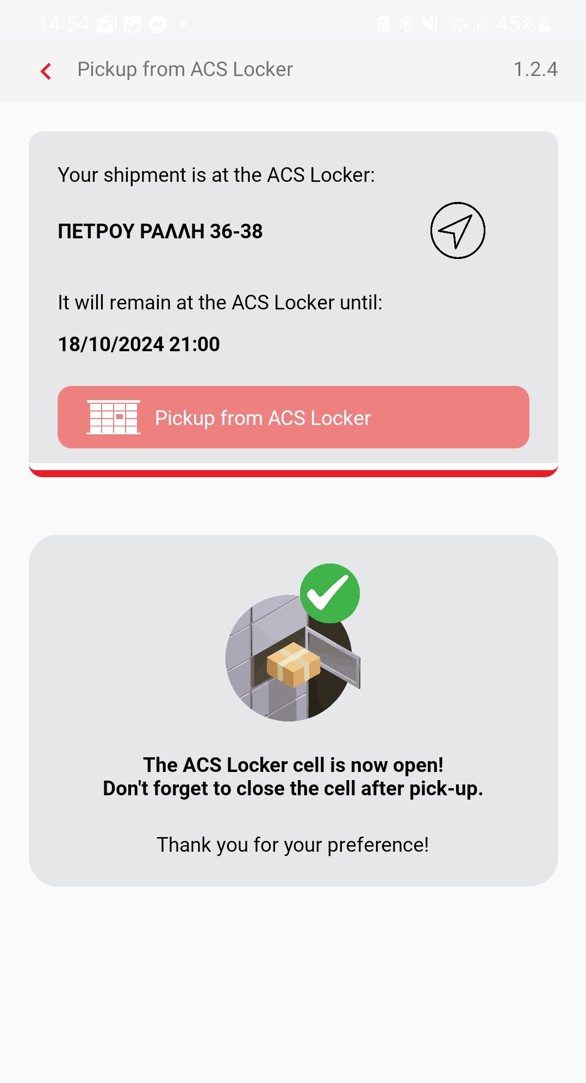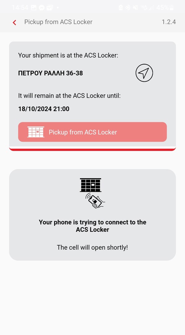 To pick up your delivery, you need to have already downloaded the ACS Mobile App on your mobile phone and tap the "Pick Up from Locker" button displayed on the home screen. The button is red only when your shipment is located in an ACS Locker and gray if its placement in the locker is still pending.