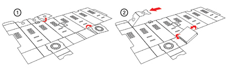 Κόβετε από τις περιμετρικές λουρίδες χαρτονιού το πρώτο τετράγωνο στο ύψος των εγκοπών (εικόνα 1). Τα δύο αυτά αποκόμματα θα τα χρησιμοποιήσετε για την extra προστασία της φιάλης που συσκευάζετε. Το ένα θα τοποθετηθεί στην μέση περίπου της φιάλης και το δεύτερο στον ΄ λαιμό ΄ της φιάλης. Στην συνέχεια θα αναδιπλώσετε όπως φαίνεται στην ακόλουθη εικόνα (εικόνα 2) το χαρτόνι προκειμένου να δημιουργήσετε την βάση και την υποδοχή του λαιμού της φιάλης στις δύο πλευρές του χαρτονιού